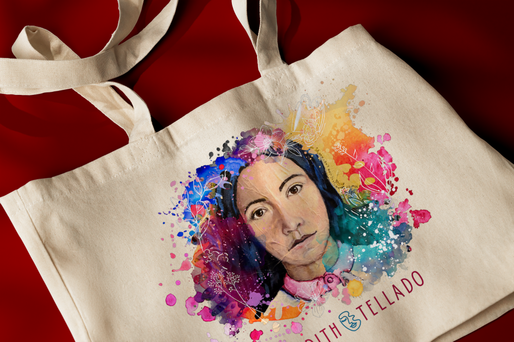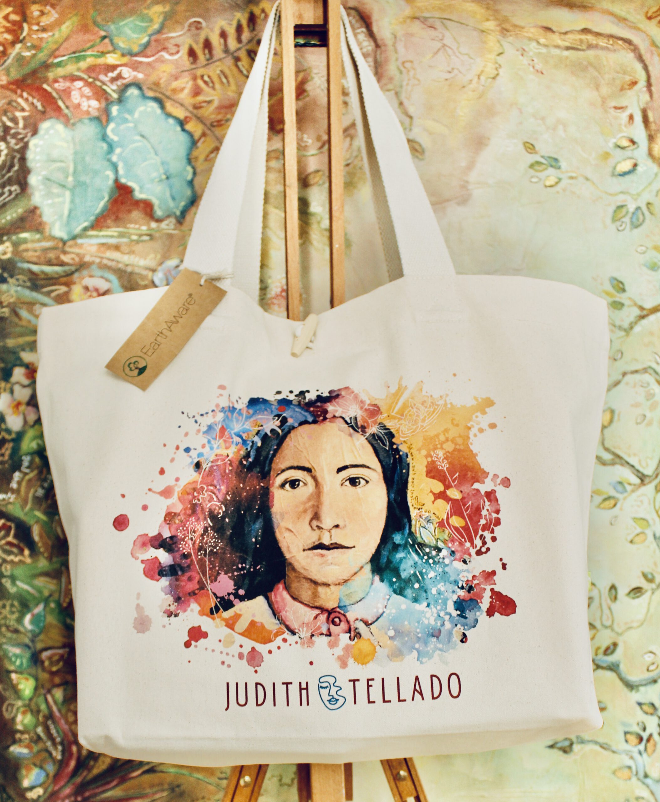 My beach bag ‘Alicia’: a high-quality fabric bag made from organic cotton with my own design, which I based on my painting ‘We Are All Made Here’ with the theme ALICE IN WONDERLAND. The bag is perfect for a day at the beach or for a quick shopping trip. It has a stylish and convenient clasp made from wood.